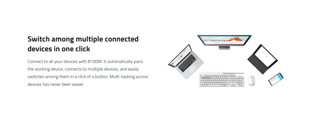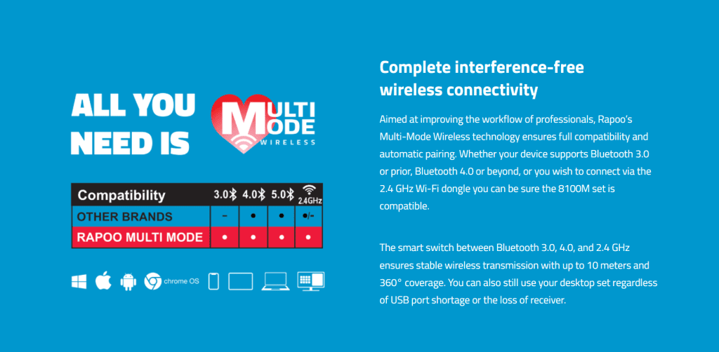 Aimed to improve professionals’ workflow, Rapoo’s Multi-Mode Wireless technology ensures full compatibility and automatic pairing. Whether your device supports Bluetooth 3.0 or prior, Bluetooth 4.0 or beyond, or you wish to connect via the 2.4 GHz Wi-Fi dongle you can be sure the 8100M set is compatible. The smart switch between Bluetooth 3.0, 4.0, and 2.4 GHz ensures stable wireless transmission with up to 10 meters and 360 coverage. You can also still use your desktop set regardless of the USB port shortage or the loss of the receiver.